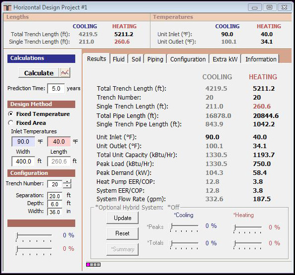 The Horizontal Design module allows the user to quickly and flexibly design nearly any type of horizontal system. The software calculates results such as the required trench/pit/bore lengths, pipe/slinky lengths, the inlet and outlet temperatures and the coefficient of performance (COP). With a powerful user interface, GLD makes it straightforward and easy to make changes, conduct "what if" modeling and optimize the final design.
